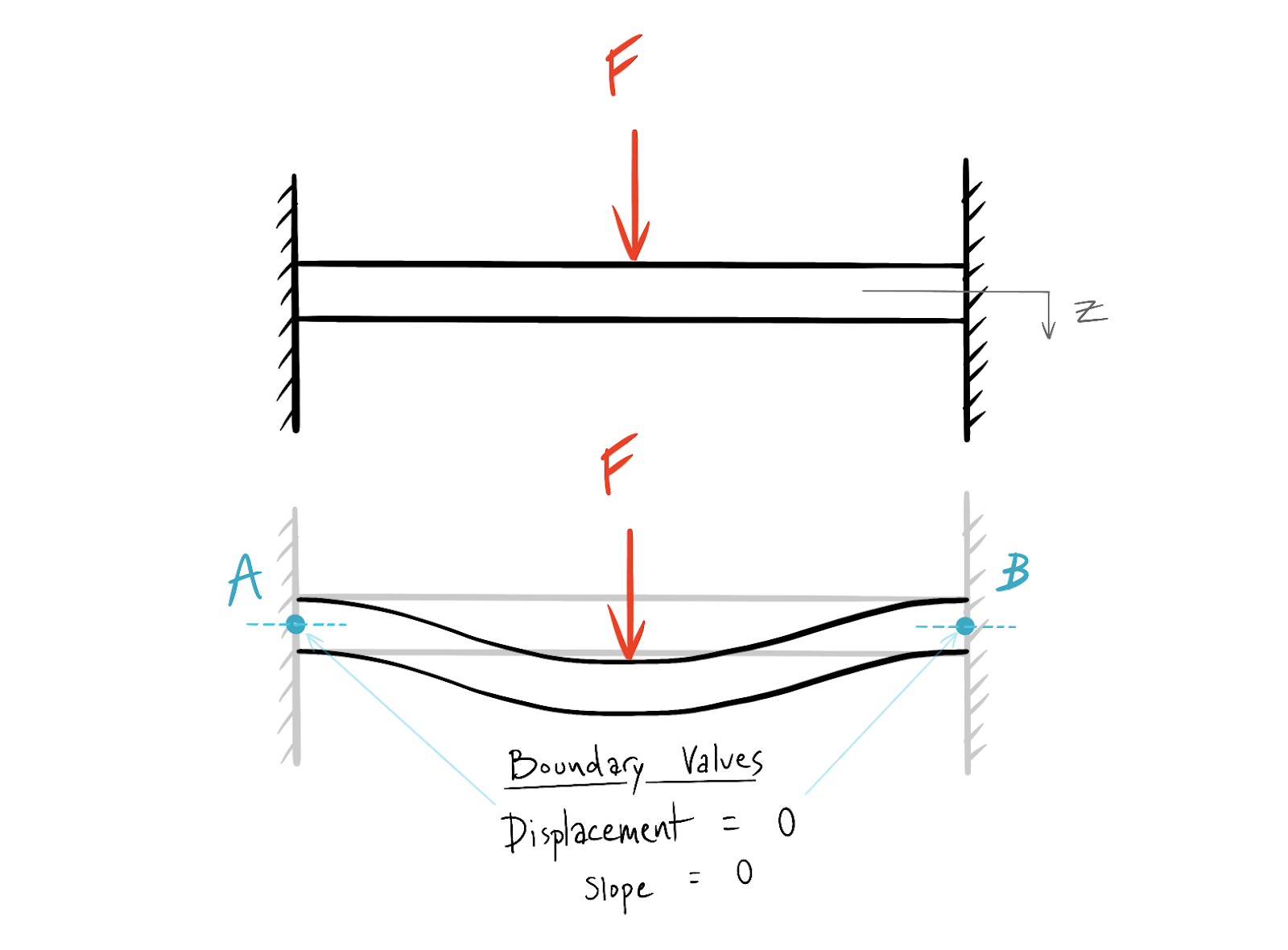 Finite Element Analysis (FEA) is a numerical method used to solve boundary value problems. A boundary value problem is mathematically represented as a system of differential equations where the solutions and derivatives are known at certain points (or boundaries). These solutions are described by boundary conditions. To put this in terms of a mechanical engineering problem we can use the example of a simple beam with clamped ends.